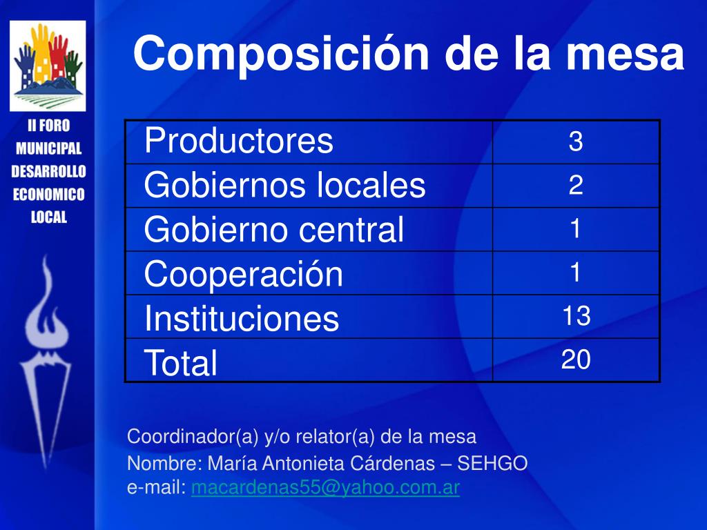 Composición de la mesa Coordinador(a) y/o relator(a) de la mesaNombre: María Antonieta Cárdenas – SEHGOe-mail: macardenas55@yahoo.com.ar Productores Gobiernos locales Gobierno central Cooperación Instituciones Total