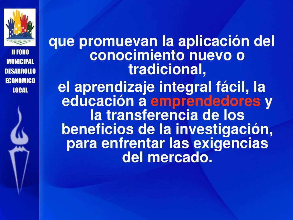 que promuevan la aplicación del conocimiento nuevo o tradicional, el aprendizaje integral fácil, la educación a emprendedores y la transferencia de los beneficios de la investigación, para enfrentar las exigencias del mercado.