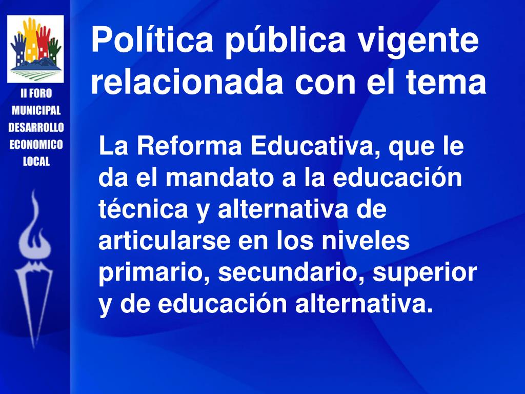 Política pública vigente relacionada con el tema La Reforma Educativa, que le da el mandato a la educación técnica y alternativa de articularse en los niveles primario, secundario, superior y de educación alternativa.