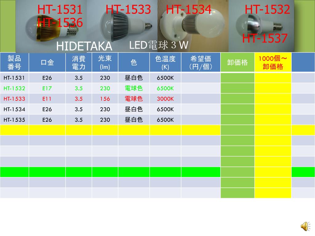 HT-1531 HT-1533 HT-1534 HT-1532 HT-1536 HT-1537 HIDETAKA LED電球3W
