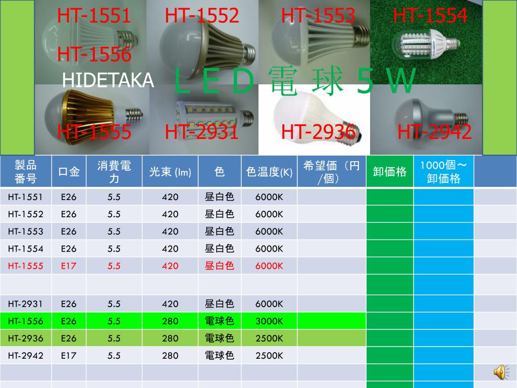 HT-1551 HT-1552 HT-1553 HT-1554 HT-1556 L E D 電 球 5 W HIDETAKA HT-1555 HT-2931 HT-2936 HT-2942