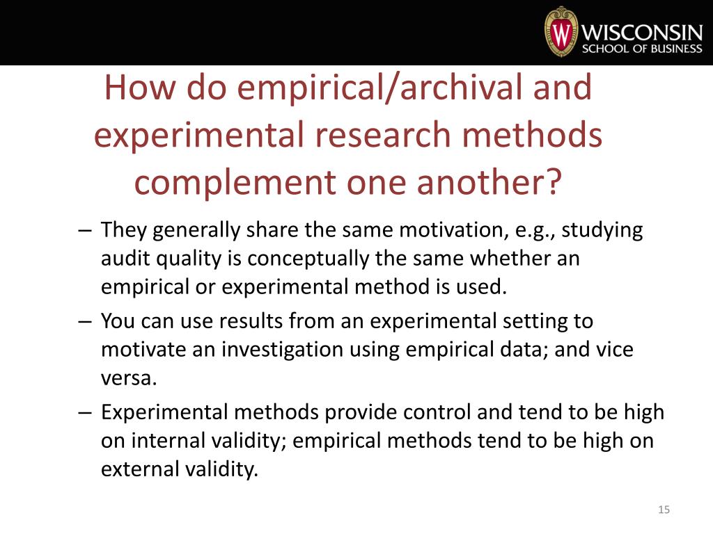 How do empirical/archival and experimental research methods complement one another? • They generally share the same motivation, e.g., studying audit quality is conceptually the same whether an empirical or experimental method is used. • You can use results from an experimental setting to motivate an investigation using empirical data; and vice versa. • Experimental methods provide control and tend to be high on internal validity; empirical methods tend to be high on external validity.