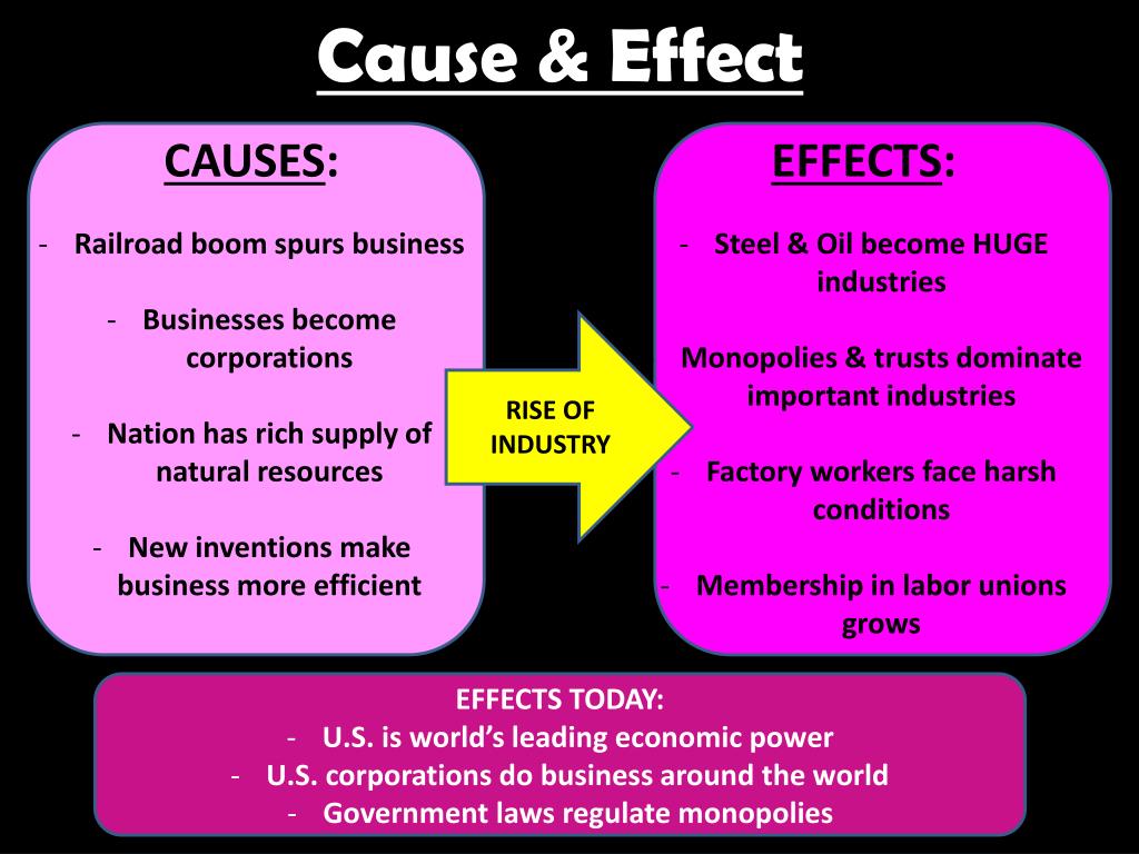 Cause & Effect • CAUSES: • Railroad boom spurs business • Businesses become corporations • Nation has rich supply of natural resources • New inventions make business more efficient • EFFECTS: • Steel & Oil become HUGE industries • Monopolies & trusts dominate important industries • Factory workers face harsh conditions • Membership in labor unions grows RISE OF INDUSTRY • EFFECTS TODAY: • U.S. is world’s leading economic power • U.S. corporations do business around the world • Government laws regulate monopolies