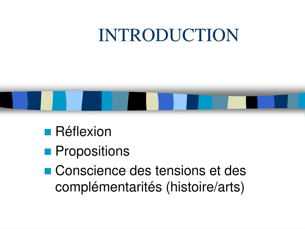 INTRODUCTION Réflexion Propositions Conscience des tensions et des complémentarités (histoire/arts)