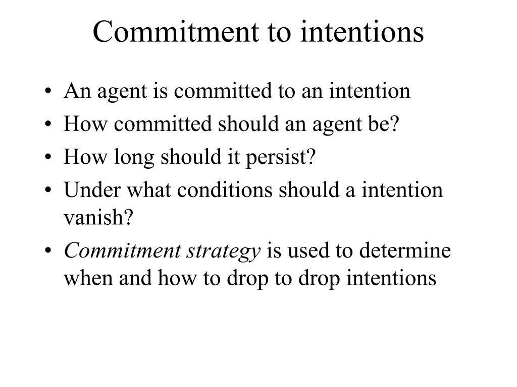 Commitment to intentions • An agent is committed to an intention • How committed should an agent be? • How long should it persist? • Under what conditions should a intention vanish? • Commitment strategy is used to determine when and how to drop to drop intentions