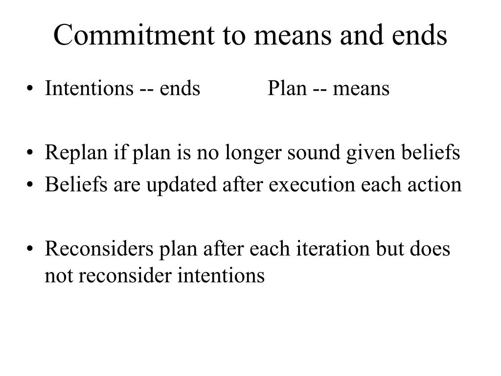 Commitment to means and ends • Intentions -- ends Plan -- means • Replan if plan is no longer sound given beliefs • Beliefs are updated after execution each action • Reconsiders plan after each iteration but does not reconsider intentions
