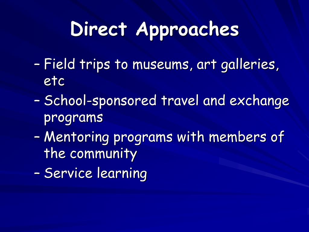 Direct Approaches • Field trips to museums, art galleries, etc • School-sponsored travel and exchange programs • Mentoring programs with members of the community • Service learning