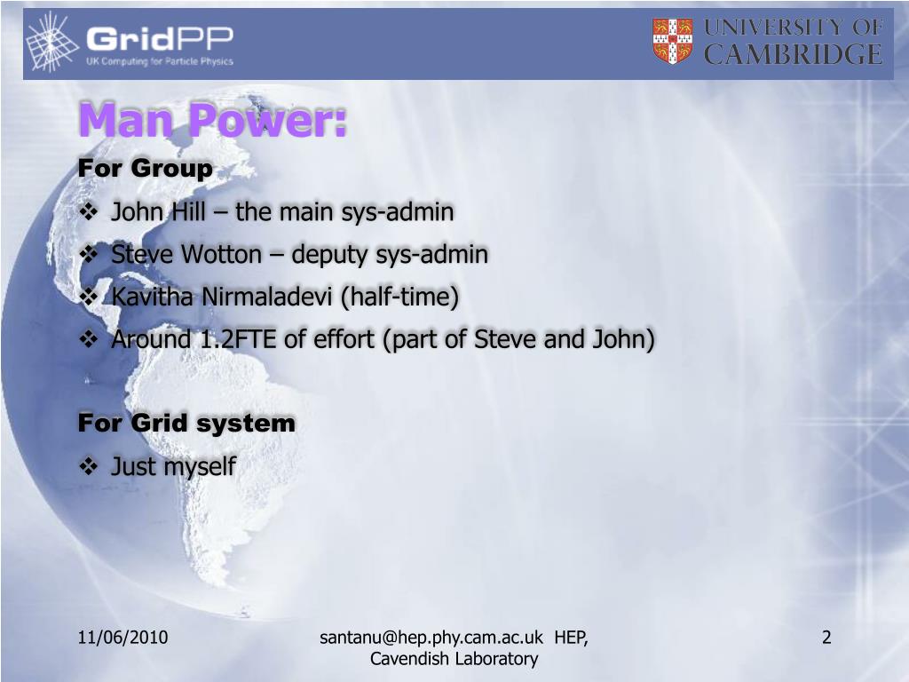 Man Power: For Group • John Hill – the main sys-admin • Steve Wotton – deputy sys-admin • KavithaNirmaladevi (half-time) • Around 1.2FTE of effort (part of Steve and John) For Grid system • Just myself santanu@hep.phy.cam.ac.uk HEP, Cavendish Laboratory