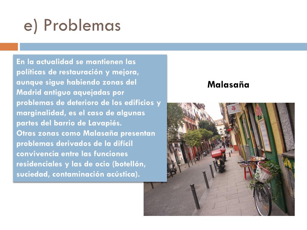 e) Problemas En la actualidad se mantienen las políticas de restauración y mejora, aunque sigue habiendo zonas del Madrid antiguo aquejadas por problemas de deterioro de los edificios y marginalidad, es el caso de algunas partes del barrio de Lavapiés. Otras zonas como Malasaña presentan problemas derivados de la difícil convivencia entre las funciones residenciales y las de ocio (botellón, suciedad, contaminación acústica). Malasaña