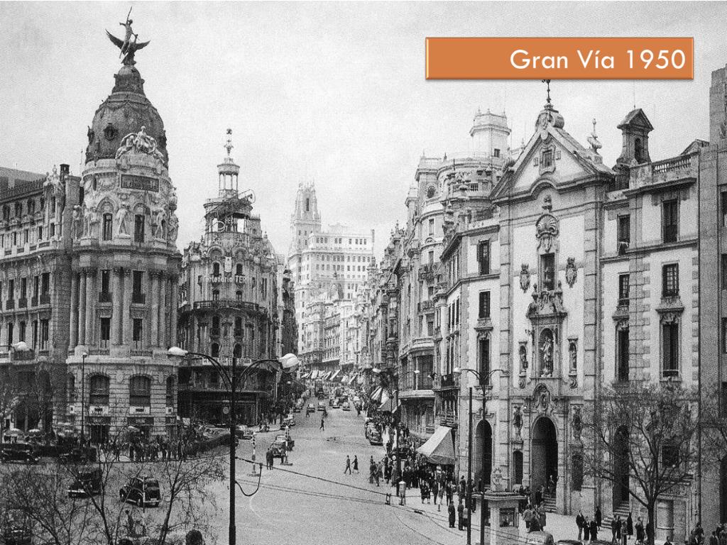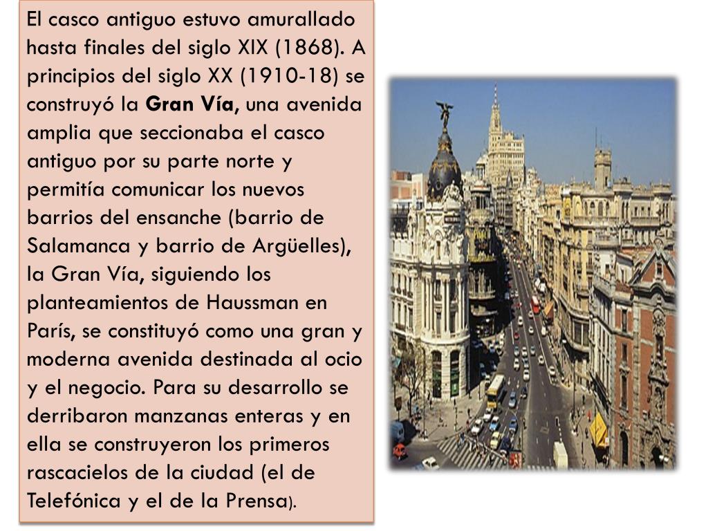 El casco antiguo estuvo amurallado hasta finales del siglo XIX (1868). A principios del siglo XX (1910-18) se construyó la Gran Vía, una avenida amplia que seccionaba el casco antiguo por su parte norte y permitía comunicar los nuevos barrios del ensanche (barrio de Salamanca y barrio de Argüelles), la Gran Vía, siguiendo los planteamientos de Haussman en París, se constituyó como una gran y moderna avenida destinada al ocio y el negocio. Para su desarrollo se derribaron manzanas enteras y en ella se construyeron los primeros rascacielos de la ciudad (el de Telefónica y el de la Prensa).