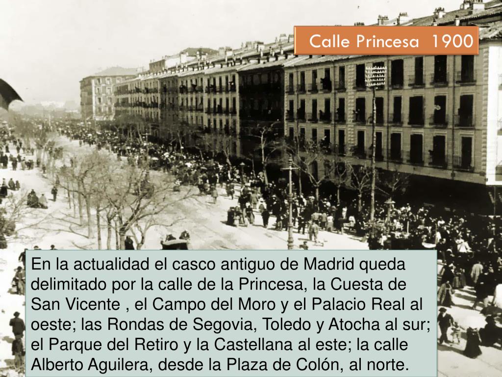 Calle Princesa 1900 En la actualidad el casco antiguo de Madrid queda delimitado por la calle de la Princesa, la Cuesta de San Vicente , el Campo del Moro y el Palacio Real al oeste; las Rondas de Segovia, Toledo y Atocha al sur; el Parque del Retiro y la Castellana al este; la calle Alberto Aguilera, desde la Plaza de Colón, al norte.