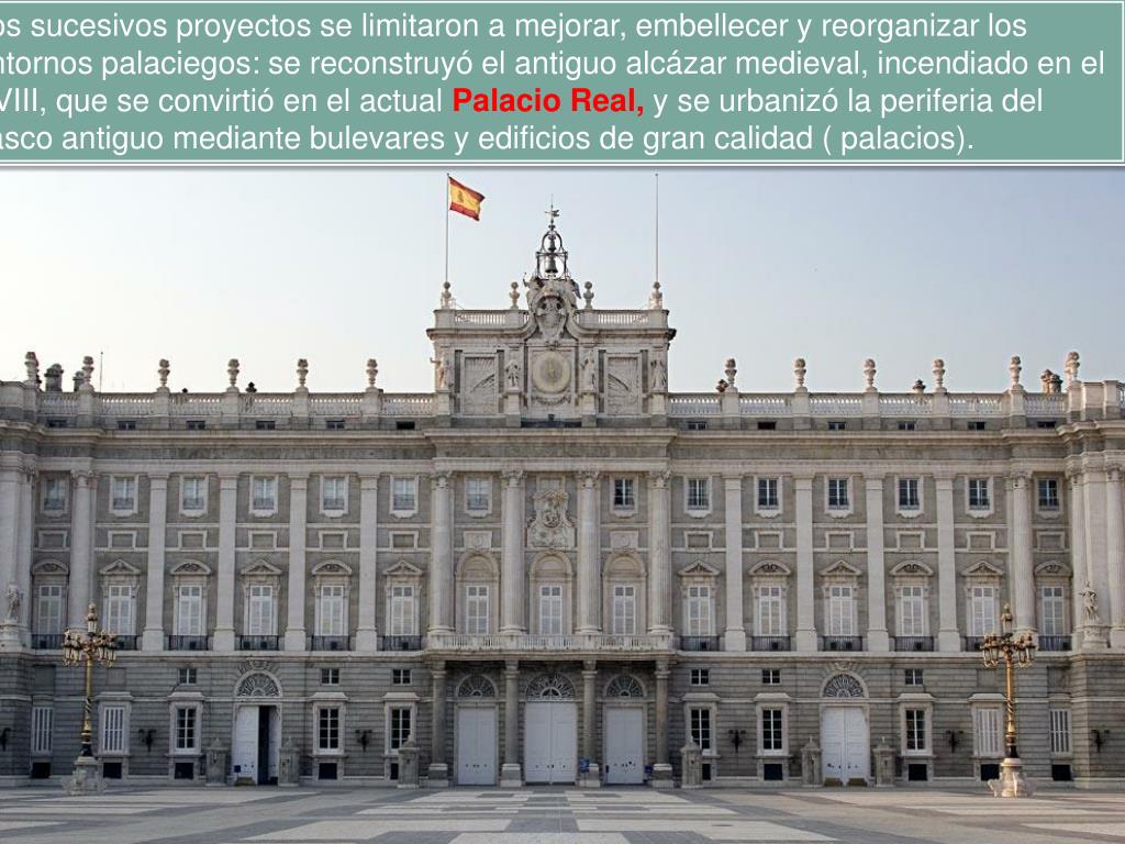 Los sucesivos proyectos se limitaron a mejorar, embellecer y reorganizar los entornos palaciegos: se reconstruyó el antiguo alcázar medieval, incendiado en el XVIII, que se convirtió en el actual Palacio Real, y se urbanizó la periferia del casco antiguo mediante bulevares y edificios de gran calidad ( palacios).