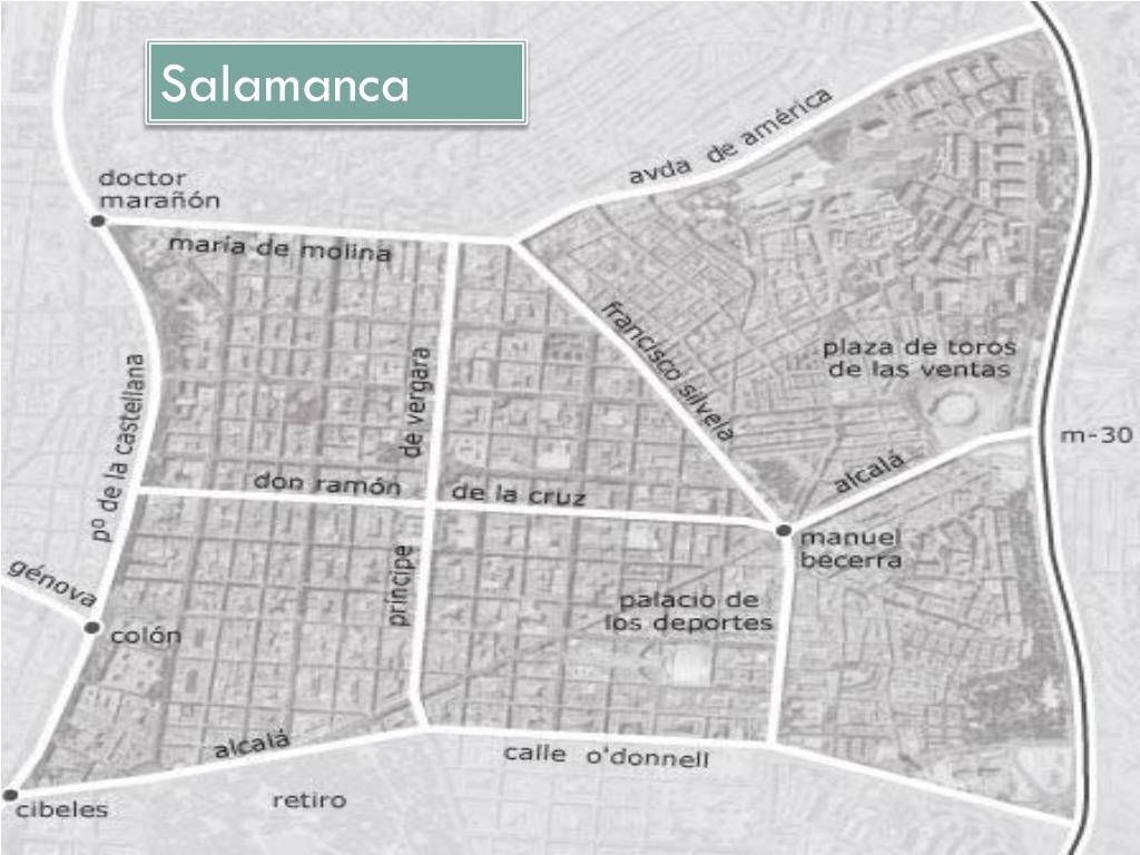 b) Diferentes áreas de la ciudad industrial El ensanche de Madrid fue diseñado por el urbanista Carlos María de Castro. El ensanche se sitúa al norte del casco viejo. El ensanche de Madrid se inició en 1860. Estaba inspirado en los planos de Haussman para París. Se localizó al norte de la ciudad, en un área que hoy queda delimitada por la red viaria conocida como Las Rondas: Paseo de la Reina Victoria, calles Raimundo Fernández Villaverde, Joaquín Costa, F.Silvela y Doctor Esquerdo.