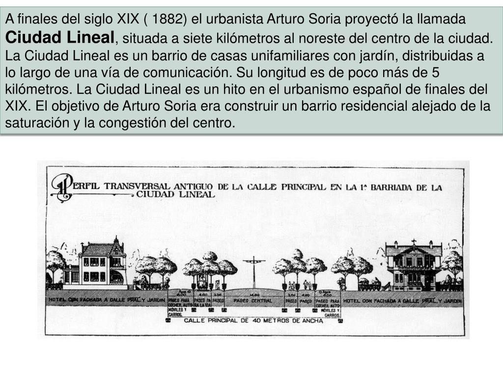 A finales del siglo XIX ( 1882) el urbanista Arturo Soria proyectó la llamada Ciudad Lineal, situada a siete kilómetros al noreste del centro de la ciudad. La Ciudad Lineal es un barrio de casas unifamiliares con jardín, distribuidas a lo largo de una vía de comunicación. Su longitud es de poco más de 5 kilómetros. La Ciudad Lineal es un hito en el urbanismo español de finales del XIX. El objetivo de Arturo Soria era construir un barrio residencial alejado de la saturación y la congestión del centro.