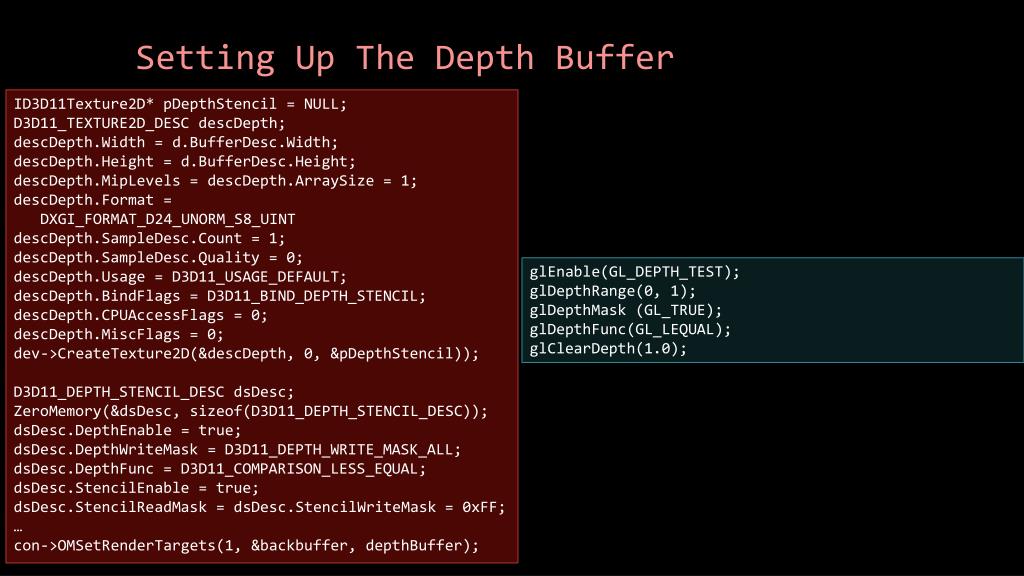 Setting Up The Depth Buffer ID3D11Texture2D* pDepthStencil = NULL; D3D11_TEXTURE2D_DESC descDepth; descDepth.Width= d.BufferDesc.Width; descDepth.Height= d.BufferDesc.Height; descDepth.MipLevels= descDepth.ArraySize= 1; descDepth.Format = DXGI_FORMAT_D24_UNORM_S8_UINT descDepth.SampleDesc.Count= 1; descDepth.SampleDesc.Quality= 0; descDepth.Usage= D3D11_USAGE_DEFAULT; descDepth.BindFlags= D3D11_BIND_DEPTH_STENCIL; descDepth.CPUAccessFlags= 0; descDepth.MiscFlags= 0; dev->CreateTexture2D(&descDepth, 0, &pDepthStencil)); D3D11_DEPTH_STENCIL_DESC dsDesc; ZeroMemory(&dsDesc, sizeof(D3D11_DEPTH_STENCIL_DESC)); dsDesc.DepthEnable= true; dsDesc.DepthWriteMask= D3D11_DEPTH_WRITE_MASK_ALL; dsDesc.DepthFunc= D3D11_COMPARISON_LESS_EQUAL; dsDesc.StencilEnable= true; dsDesc.StencilReadMask= dsDesc.StencilWriteMask= 0xFF; … con->OMSetRenderTargets(1, &backbuffer, depthBuffer); glEnable(GL_DEPTH_TEST); glDepthRange(0, 1); glDepthMask(GL_TRUE); glDepthFunc(GL_LEQUAL); glClearDepth(1.0);