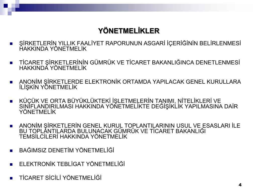 YÖNETMELİKLER • ŞİRKETLERİN YILLIK FAALİYET RAPORUNUN ASGARİ İÇERİĞİNİN BELİRLENMESİ HAKKINDA YÖNETMELİK • TİCARET ŞİRKETLERİNİN GÜMRÜK VE TİCARET BAKANLIĞINCA DENETLENMESİ HAKKINDA YÖNETMELİK • ANONİM ŞİRKETLERDE ELEKTRONİK ORTAMDA YAPILACAK GENEL KURULLARA İLİŞKİN YÖNETMELİK • KÜÇÜK VE ORTA BÜYÜKLÜKTEKİ İŞLETMELERİN TANIMI, NİTELİKLERİ VE SINIFLANDIRILMASI HAKKINDA YÖNETMELİKTE DEĞİŞİKLİK YAPILMASINA DAİR YÖNETMELİK • ANONİM ŞİRKETLERİN GENEL KURUL TOPLANTILARININ USUL VE ESASLARI İLE BU TOPLANTILARDA BULUNACAK GÜMRÜK VE TİCARET BAKANLIĞI TEMSİLCİLERİ HAKKINDA YÖNETMELİK • BAĞIMSIZ DENETİM YÖNETMELİĞİ • ELEKTRONİK TEBLİGAT YÖNETMELİĞİ • TİCARET SİCİLİ YÖNETMELİĞİ