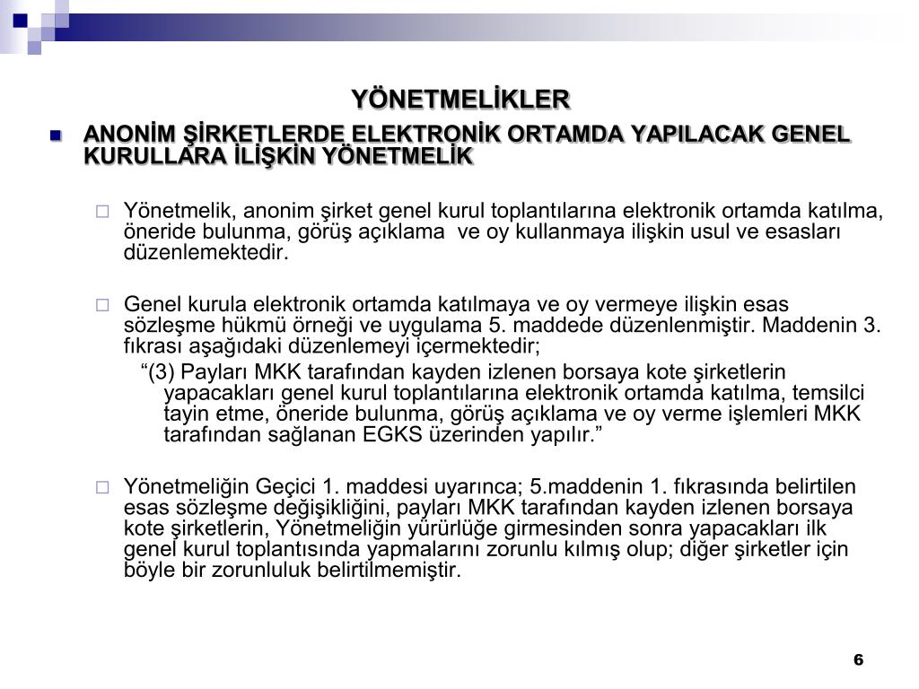 YÖNETMELİKLER • ANONİM ŞİRKETLERDE ELEKTRONİK ORTAMDA YAPILACAK GENEL KURULLARA İLİŞKİN YÖNETMELİK • Yönetmelik, anonim şirket genel kurul toplantılarına elektronik ortamda katılma, öneride bulunma, görüş açıklama ve oy kullanmaya ilişkin usul ve esasları düzenlemektedir. • Genel kurula elektronik ortamda katılmaya ve oy vermeye ilişkin esas sözleşme hükmü örneği ve uygulama 5. maddede düzenlenmiştir. Maddenin 3. fıkrası aşağıdaki düzenlemeyi içermektedir; “(3) Payları MKK tarafından kayden izlenen borsaya kote şirketlerin yapacakları genel kurul toplantılarına elektronik ortamda katılma, temsilci tayin etme, öneride bulunma, görüş açıklama ve oy verme işlemleri MKK tarafından sağlanan EGKS üzerinden yapılır.” • Yönetmeliğin Geçici 1. maddesi uyarınca; 5.maddenin 1. fıkrasında belirtilen esas sözleşme değişikliğini, payları MKK tarafından kayden izlenen borsaya kote şirketlerin, Yönetmeliğin yürürlüğe girmesinden sonra yapacakları ilk genel kurul toplantısında yapmalarını zorunlu kılmış olup; diğer şirketler için böyle bir zorunluluk belirtilmemiştir.