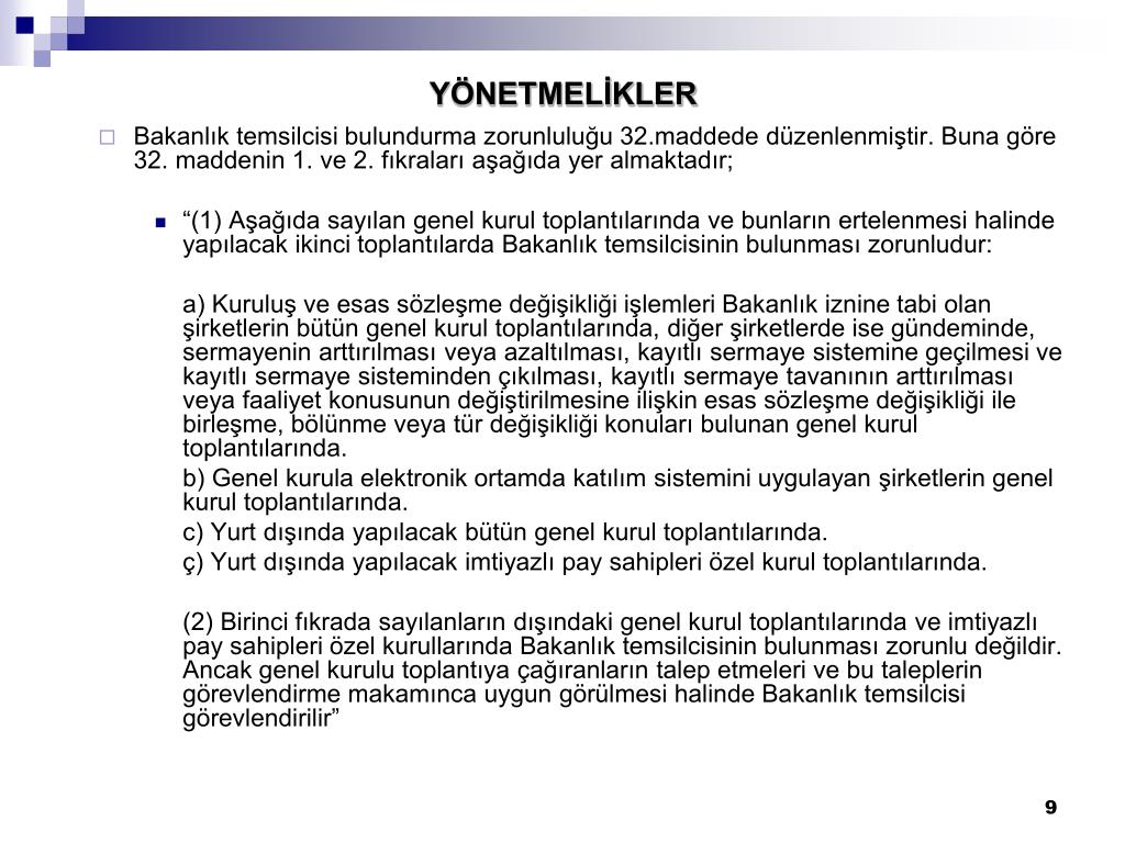 YÖNETMELİKLER • Bakanlık temsilcisi bulundurma zorunluluğu 32.maddede düzenlenmiştir. Buna göre 32. maddenin 1. ve 2. fıkraları aşağıda yer almaktadır; • “(1) Aşağıda sayılan genel kurul toplantılarında ve bunların ertelenmesi halinde yapılacak ikinci toplantılarda Bakanlık temsilcisinin bulunması zorunludur: a) Kuruluş ve esas sözleşme değişikliği işlemleri Bakanlık iznine tabi olan şirketlerin bütün genel kurul toplantılarında, diğer şirketlerde ise gündeminde, sermayenin arttırılması veya azaltılması, kayıtlı sermaye sistemine geçilmesi ve kayıtlı sermaye sisteminden çıkılması, kayıtlı sermaye tavanının arttırılması veya faaliyet konusunun değiştirilmesine ilişkin esas sözleşme değişikliği ile birleşme, bölünme veya tür değişikliği konuları bulunan genel kurul toplantılarında. b) Genel kurula elektronik ortamda katılım sistemini uygulayan şirketlerin genel kurul toplantılarında. c) Yurt dışında yapılacak bütün genel kurul toplantılarında. ç) Yurt dışında yapılacak imtiyazlı pay sahipleri özel kurul toplantılarında. (2) Birinci fıkrada sayılanların dışındaki genel kurul toplantılarında ve imtiyazlı pay sahipleri özel kurullarında Bakanlık temsilcisinin bulunması zorunlu değildir. Ancak genel kurulu toplantıya çağıranların talep etmeleri ve bu taleplerin görevlendirme makamınca uygun görülmesi halinde Bakanlık temsilcisi görevlendirilir”