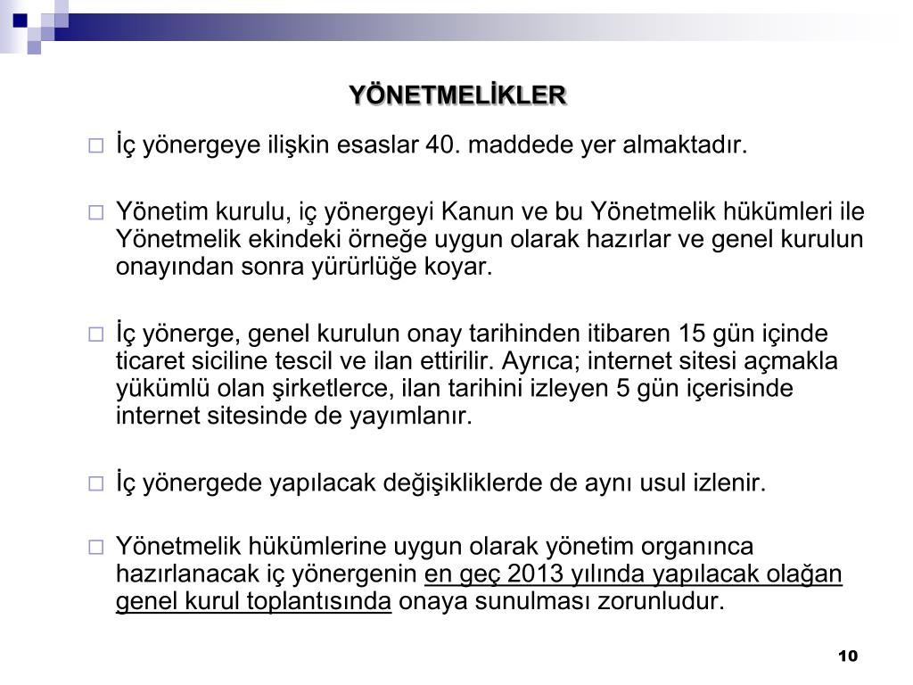 YÖNETMELİKLER • İç yönergeye ilişkin esaslar 40. maddede yer almaktadır. • Yönetim kurulu, iç yönergeyi Kanun ve bu Yönetmelik hükümleri ile Yönetmelik ekindeki örneğe uygun olarak hazırlar ve genel kurulun onayından sonra yürürlüğe koyar. • İç yönerge, genel kurulun onay tarihinden itibaren 15 gün içinde ticaret siciline tescil ve ilan ettirilir. Ayrıca; internet sitesi açmakla yükümlü olan şirketlerce, ilan tarihini izleyen 5 gün içerisinde internet sitesinde de yayımlanır. • İç yönergede yapılacak değişikliklerde de aynı usul izlenir. • Yönetmelik hükümlerine uygun olarak yönetim organınca hazırlanacak iç yönergenin en geç 2013 yılında yapılacak olağan genel kurul toplantısında onaya sunulması zorunludur.