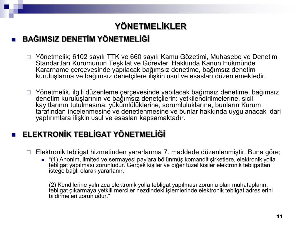 YÖNETMELİKLER • BAĞIMSIZ DENETİM YÖNETMELİĞİ • Yönetmelik; 6102 sayılı TTK ve 660 sayılı Kamu Gözetimi, Muhasebe ve Denetim Standartları Kurumunun Teşkilat ve Görevleri Hakkında Kanun Hükmünde Kararname çerçevesinde yapılacak bağımsız denetime, bağımsız denetim kuruluşlarına ve bağımsız denetçilere ilişkin usul ve esasları düzenlemektedir. • Yönetmelik, ilgili düzenleme çerçevesinde yapılacak bağımsız denetime, bağımsız denetim kuruluşlarının ve bağımsız denetçilerin: yetkilendirilmelerine, sicil kayıtlarının tutulmasına, yükümlülüklerine, sorumluluklarına, bunların Kurum tarafından incelenmesine ve denetlenmesine ve bunlar hakkında uygulanacak idari yaptırımlara ilişkin usul ve esasları kapsamaktadır. • ELEKTRONİK TEBLİGAT YÖNETMELİĞİ • Elektronik tebligat hizmetinden yararlanma 7. maddede düzenlenmiştir. Buna göre; • “(1) Anonim, limited ve sermayesi paylara bölünmüş komandit şirketlere, elektronik yolla tebligat yapılması zorunludur. Gerçek kişiler ve diğer tüzel kişiler elektronik tebligattan isteğe bağlı olarak yararlanır. (2) Kendilerine yalnızca elektronik yolla tebligat yapılması zorunlu olan muhatapların, tebligat çıkarmaya yetkili merciler nezdindeki işlemlerinde elektronik tebligat adreslerini bildirmeleri zorunludur.”