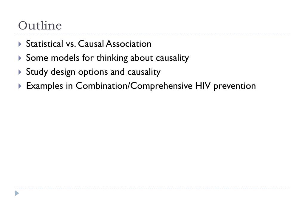 Outline • Statistical vs. Causal Association • Some models for thinking about causality • Study design options and causality • Examples in Combination/Comprehensive HIV prevention
