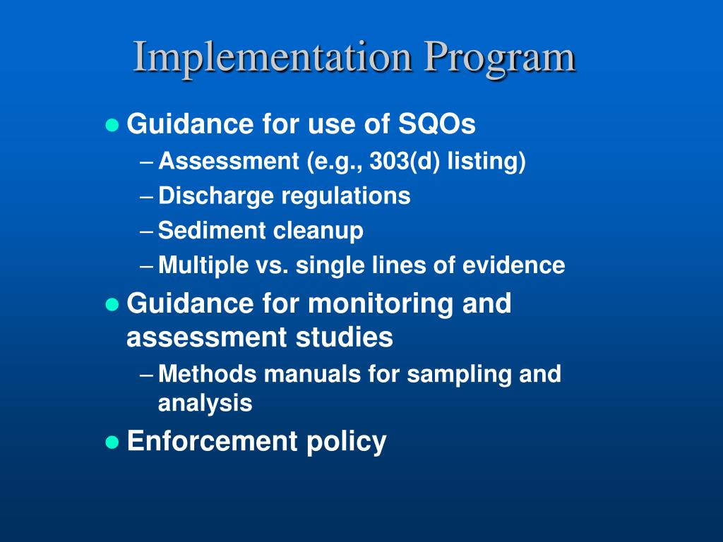 Implementation Program • Guidance for use of SQOs • Assessment (e.g., 303(d) listing) • Discharge regulations • Sediment cleanup • Multiple vs. single lines of evidence • Guidance for monitoring and assessment studies • Methods manuals for sampling and analysis • Enforcement policy