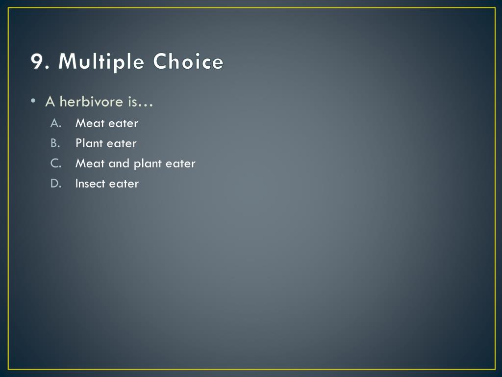 9. Multiple Choice • A herbivore is… • Meat eater • Plant eater • Meat and plant eater • Insect eater