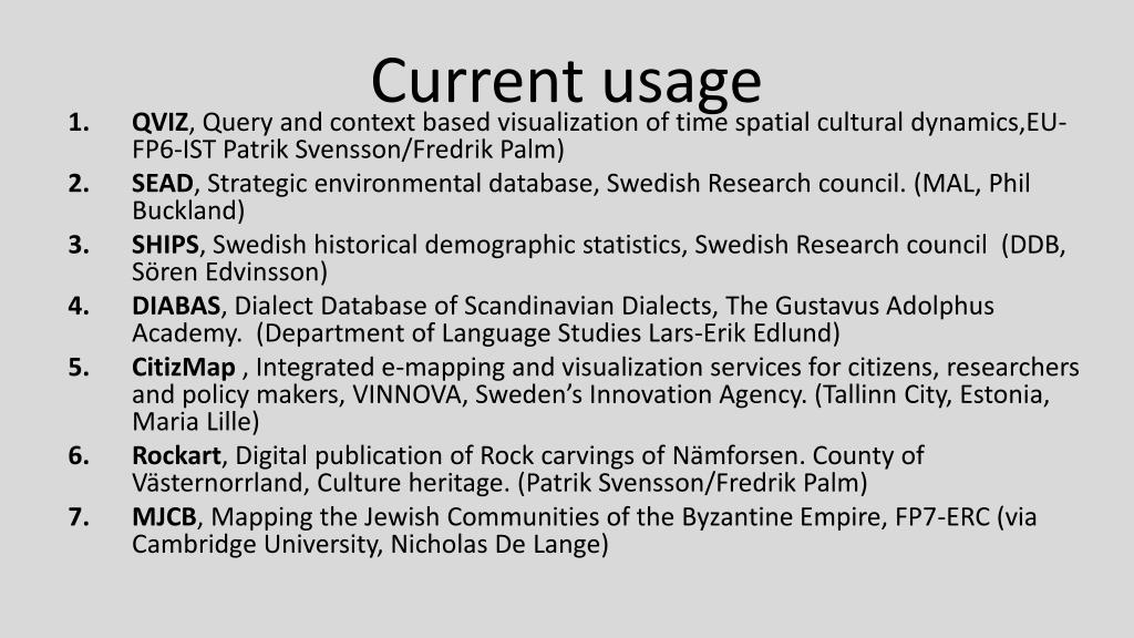Current usage • QVIZ, Query and context based visualization of time spatial cultural dynamics,EU-FP6-IST Patrik Svensson/Fredrik Palm) • SEAD, Strategic environmental database, Swedish Research council. (MAL, Phil Buckland) • SHIPS, Swedish historical demographic statistics, Swedish Research council (DDB, Sören Edvinsson) • DIABAS, Dialect Database of Scandinavian Dialects, The Gustavus Adolphus Academy. (Department of Language Studies Lars-Erik Edlund) • CitizMap, Integrated e-mapping and visualization services for citizens, researchers and policy makers, VINNOVA, Sweden’s Innovation Agency. (Tallinn City, Estonia, Maria Lille) • Rockart, Digital publication of Rock carvings of Nämforsen. County of Västernorrland, Culture heritage. (Patrik Svensson/Fredrik Palm) • MJCB, Mapping the Jewish Communities of the Byzantine Empire, FP7-ERC (via Cambridge University, Nicholas De Lange)