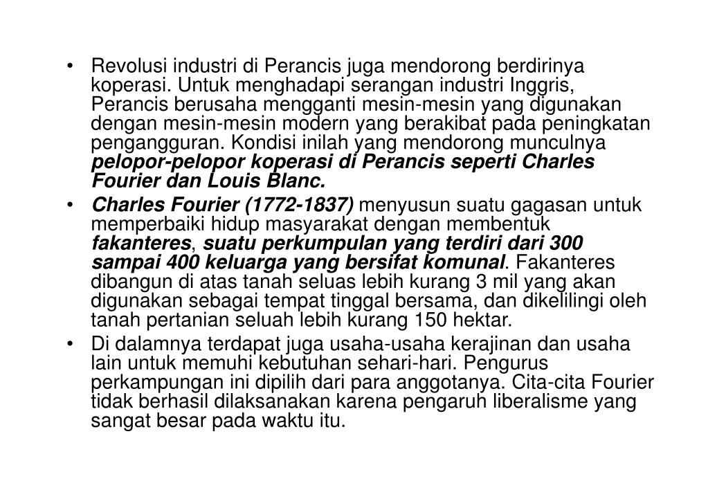 Revolusi industri di Perancis juga mendorong berdirinya koperasi. Untuk menghadapi serangan industri Inggris, Perancis berusaha mengganti mesin-mesin yang digunakan dengan mesin-mesin modern yang berakibat pada peningkatan pengangguran. Kondisi inilah yang mendorong munculnya pelopor-pelopor koperasi di Perancis seperti Charles Fourier dan Louis Blanc. • Charles Fourier (1772-1837) menyusun suatu gagasan untuk memperbaiki hidup masyarakat dengan membentuk fakanteres, suatu perkumpulan yang terdiri dari 300 sampai 400 keluarga yang bersifat komunal. Fakanteres dibangun di atas tanah seluas lebih kurang 3 mil yang akan digunakan sebagai tempat tinggal bersama, dan dikelilingi oleh tanah pertanian seluah lebih kurang 150 hektar. • Di dalamnya terdapat juga usaha-usaha kerajinan dan usaha lain untuk memuhi kebutuhan sehari-hari. Pengurus perkampungan ini dipilih dari para anggotanya. Cita-cita Fourier tidak berhasil dilaksanakan karena pengaruh liberalisme yang sangat besar pada waktu itu.