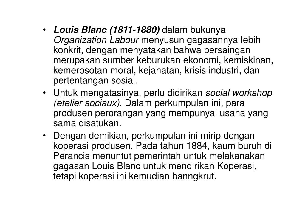Louis Blanc (1811-1880) dalam bukunya Organization Labour menyusun gagasannya lebih konkrit, dengan menyatakan bahwa persaingan merupakan sumber keburukan ekonomi, kemiskinan, kemerosotan moral, kejahatan, krisis industri, dan pertentangan sosial. • Untuk mengatasinya, perlu didirikan social workshop (etelier sociaux). Dalam perkumpulan ini, para produsen perorangan yang mempunyai usaha yang sama disatukan. • Dengan demikian, perkumpulan ini mirip dengan koperasi produsen. Pada tahun 1884, kaum buruh di Perancis menuntut pemerintah untuk melakanakan gagasan Louis Blanc untuk mendirikan Koperasi, tetapi koperasi ini kemudian banngkrut.