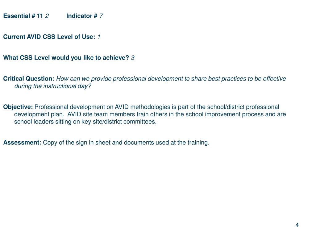 Essential # 11 2 Indicator # 7 Current AVID CSS Level of Use: 1 What CSS Level would you like to achieve? 3 Critical Question: How can we provide professional development to share best practices to be effective during the instructional day? Objective: Professional development on AVID methodologies is part of the school/district professional development plan. AVID site team members train others in the school improvement process and are school leaders sitting on key site/district committees. Assessment: Copy of the sign in sheet and documents used at the training.