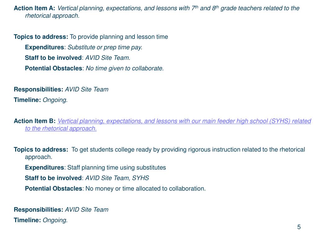Action Item A: Vertical planning, expectations, and lessons with 7th and 8th grade teachers related to the rhetorical approach. Topics to address: To provide planning and lesson time Expenditures: Substitute or prep time pay. Staff to be involved: AVID Site Team. Potential Obstacles: No time given to collaborate. Responsibilities: AVID Site Team Timeline: Ongoing. Action Item B: Vertical planning, expectations, and lessons with our main feeder high school (SYHS) related to the rhetorical approach. Topics to address: To get students college ready by providing rigorous instruction related to the rhetorical approach. Expenditures: Staff planning time using substitutes Staff to be involved: AVID Site Team, SYHS Potential Obstacles: No money or time allocated to collaboration. Responsibilities: AVID Site Team Timeline: Ongoing.