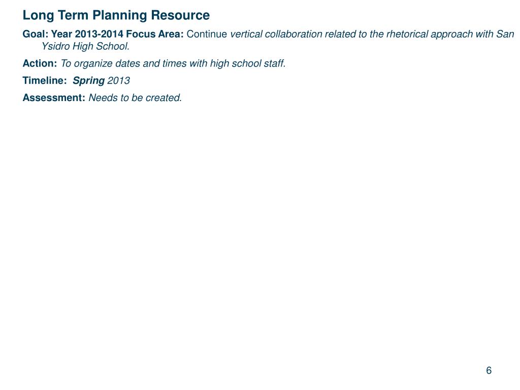 Long Term Planning Resource Goal: Year 2013-2014 Focus Area: Continue vertical collaboration related to the rhetorical approach with San Ysidro High School. Action: To organize dates and times with high school staff. Timeline: Spring 2013 Assessment: Needs to be created.