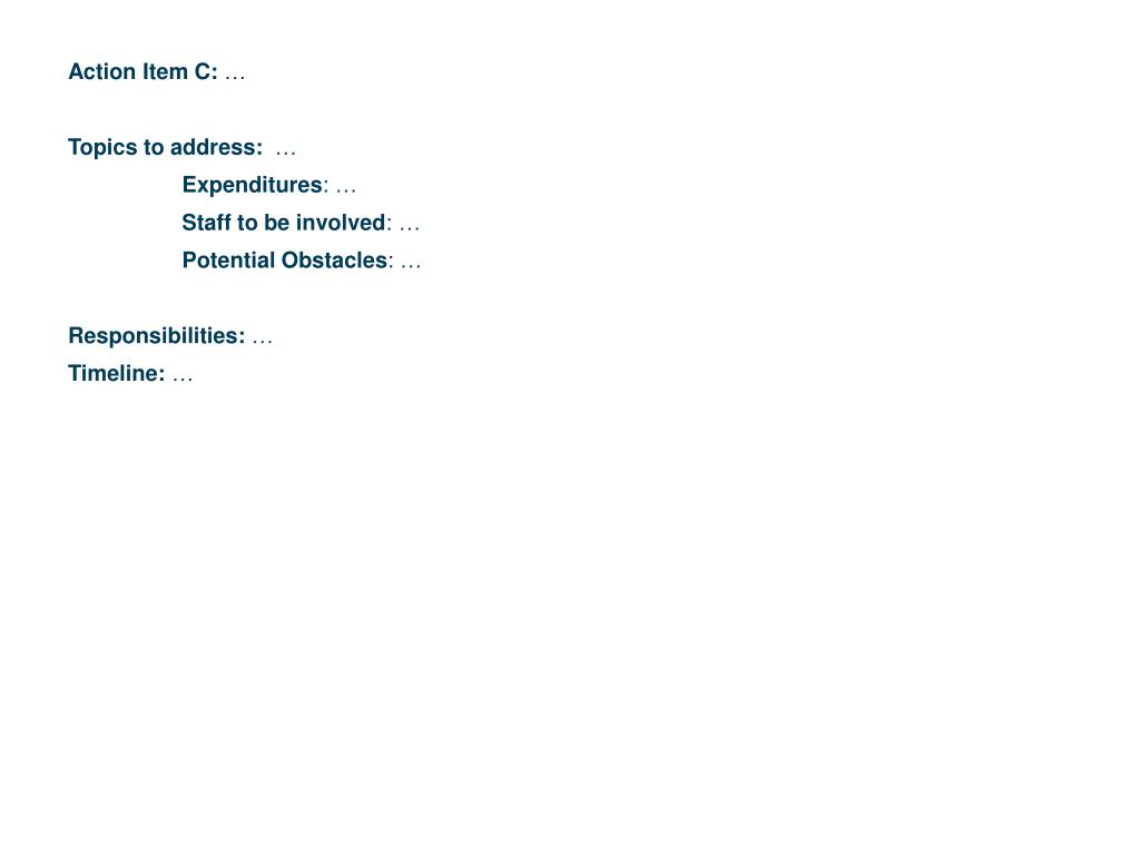 Action Item C: … Topics to address: … Expenditures: … Staff to be involved: … Potential Obstacles: … Responsibilities: … Timeline: …