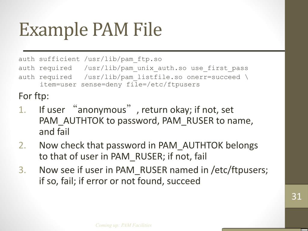 Pluggable Authentication Modules (PAM) • Idea: when program needs to authenticate, it checks central repository for methods to use • Library call: pam_authenticate • Accesses file with name of program in /etc/pam.d/ • Modules do authentication checking • binding (new): succeed immediately upon success, otherwise continue down the chain, but ultimately fail • sufficient: succeed immediately if module succeeds • required: fail if module fails, but all required modules executed before reporting failure • requisite: like required, but don’t check all modules upon failure • optional: invoke only, but result is ignored 30 30 Coming up: Example PAM File