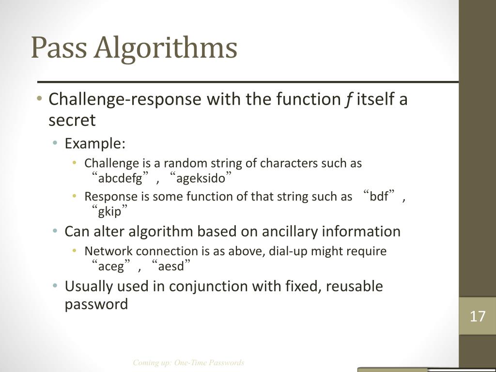 Challenge-Response • User, system share a secret function f (in practice, f is a • known function with unknown parameters, such as a • cryptographic key) request to authenticate system user random message r (the challenge) system user f(r) (the response) system user 16 Coming up: Pass Algorithms 16