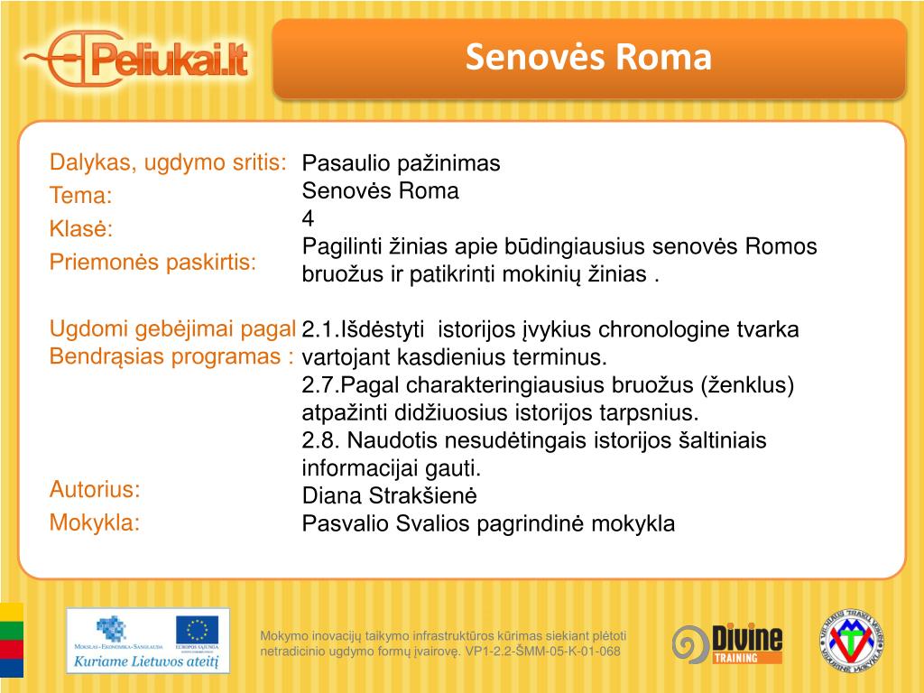 Senovės Roma. Dalykas, ugdymo sritis: Tema: Klasė: Priemonės paskirtis: Ugdomi gebėjimai pagal Bendrąsias programas : Autorius : Mokykla:. Pasaulio pažinimas Senovės Roma 4 Pa gilinti žinias apie b ū dingiausius senovės Romos bruožus ir patikrinti mokinių žinias .