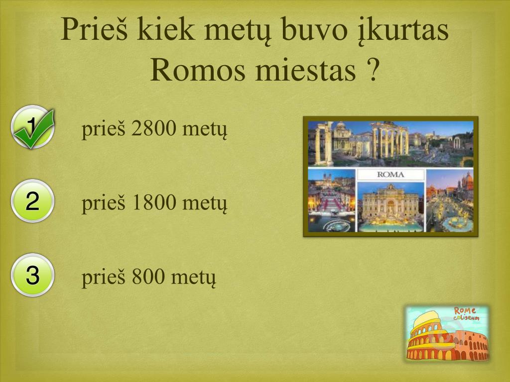 Prieš kiek metų buvo įkurtas Romos miestas ? prieš 2800 metų prieš 1800 metų prieš 800 metų