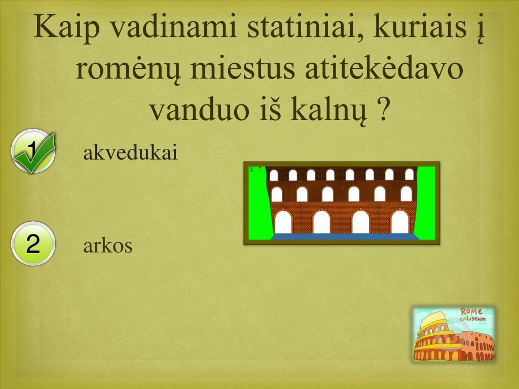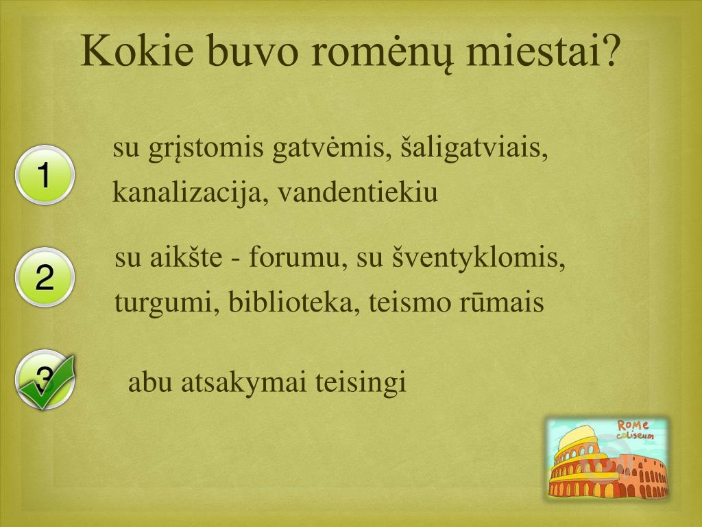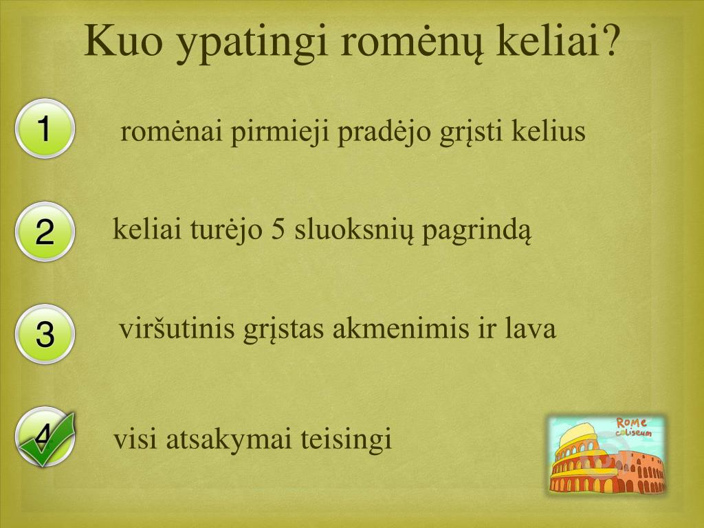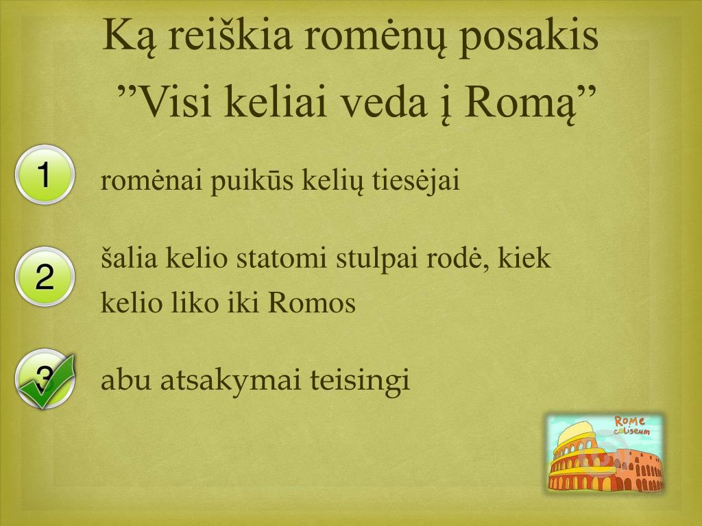 Ką reiškia romėnų posakis ”Visi keliai veda į Romą” romėnai puikūs kelių tiesėjai šalia kelio statomi stulpai rodė, kiek kelio liko iki Romos abu atsakymai teisingi