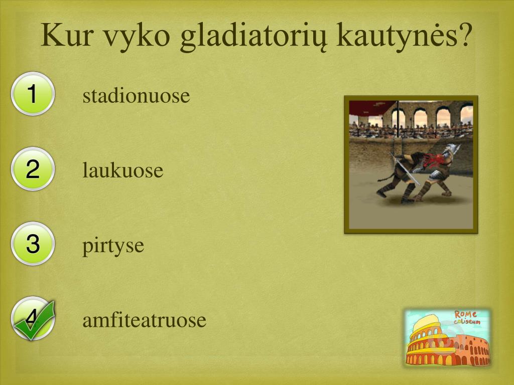 Kur vyko gladiatorių kautynės? stadionuose laukuose pirtyse amfiteatruose