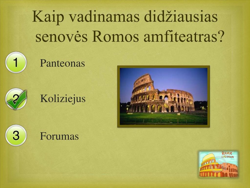Kokie statiniai garsina Romą? Koliziejus, Panteonas, Forumas Koliziejus, Panteonas, Piramidės Koliziejus, Forumas, Akropolis