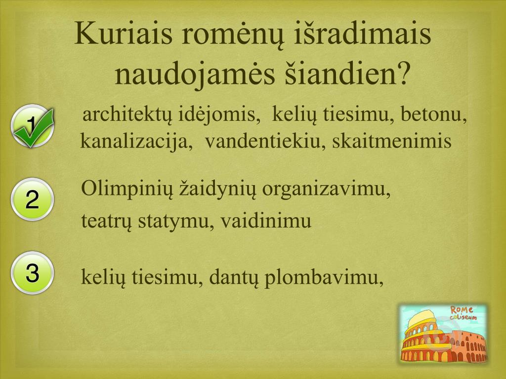 Kuriais romėnų išradimais naudojamės šiandien? architektų idėjomis, kelių tiesimu, betonu, kanalizacija, vandentiekiu, skaitmenimis Olimpinių žaidynių organizavimu, teatrų statymu, vaidinimu kelių tiesimu, dantų plombavimu,