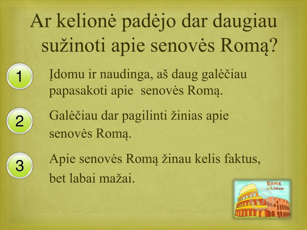 Ar kelionė padėjo dar daugiau sužinoti apie senovės Romą? Įdomu ir naudinga, aš daug galėčiau papasakoti apie senovės Romą. Galėčiau dar pagilinti žinias apie senovėsRomą. Apie senovės Romą žinau kelis faktus, bet labai mažai.