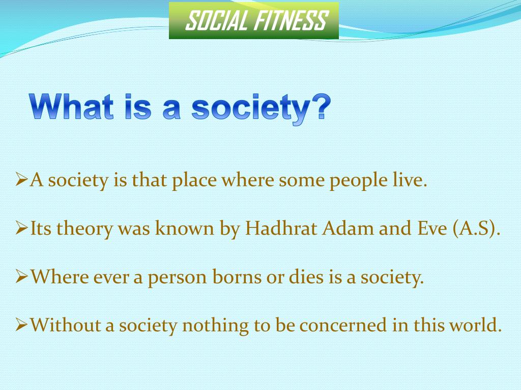 SOCIAL FITNESS What is a society? • A society is that place where some people live. • Its theory was known by Hadhrat Adam and Eve (A.S). • Where ever a person borns or dies is a society. • Without a society nothing to be concerned in this world.