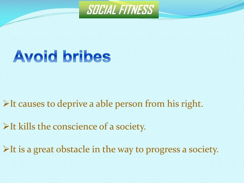 SOCIAL FITNESS Avoid bribes • It causes to deprive a able person from his right. • It kills the conscience of a society. • It is a great obstacle in the way to progress a society.