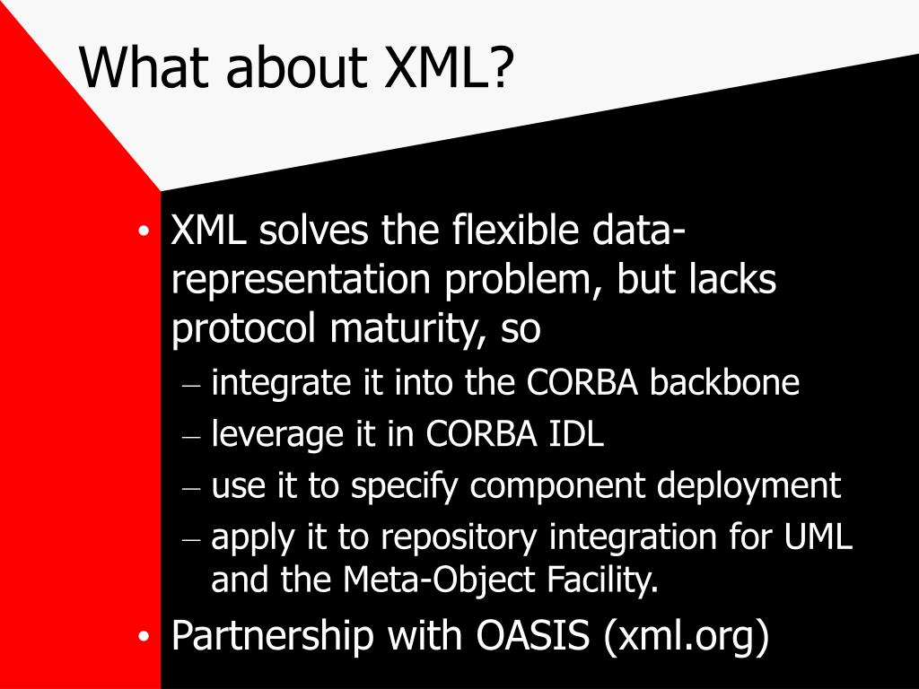 What about XML? • XML solves the flexible data-representation problem, but lacks protocol maturity, so • integrate it into the CORBA backbone • leverage it in CORBA IDL • use it to specify component deployment • apply it to repository integration for UML and the Meta-Object Facility. • Partnership with OASIS (xml.org)