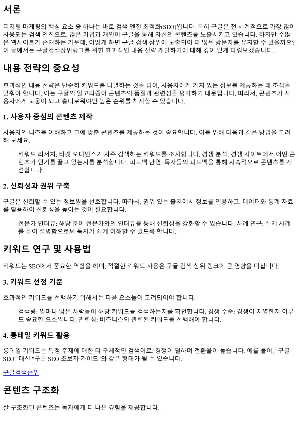 서론 디지털마케팅의핵심요소중하나는바로검색엔진최적화(SEO)입니다. 특히구글은전세계적으로가장많이 사용되는검색엔진으로, 많은기업과개인이구글을통해자신의콘텐츠를노출시키고있습니다. 하지만수많 은웹사이트가존재하는가운데, 어떻게하면구글검색상위에노출되어더많은방문자를유치할수있을까요? 이글에서는구글검색상위랭크를위한효과적인내용전략개발하기에대해깊이있게다뤄보겠습니다. 내용전략의중요성 효과적인내용전략은단순히키워드를나열하는것을넘어, 사용자에게가치있는정보를제공하는데초점을 맞춰야합니다. 이는구글의알고리즘이콘텐츠의품질과관련성을평가하기때문입니다. 따라서, 콘텐츠가사 용자에게도움이되고흥미로워야만높은순위를차지할수있습니다. 1. 사용자중심의콘텐츠제작 사용자의니즈를이해하고그에맞춘콘텐츠를제공하는것이중요합니다. 이를위해다음과같은방법을고려 해보세요. 키워드리서치: 타겟오디언스가자주검색하는키워드를조사합니다. 경쟁분석: 경쟁사이트에서어떤콘 텐츠가인기를끌고있는지를분석합니다. 피드백반영: 독자들의피드백을통해지속적으로콘텐츠를개 선합니다. 2. 신뢰성과권위구축 구글은신뢰할수있는정보원을선호합니다. 따라서, 권위있는출처에서정보를인용하고, 데이터와통계자료 를활용하여신뢰성을높이는것이필요합니다. 전문가인터뷰: 해당분야전문가와의인터뷰를통해신뢰성을강화할수있습니다. 사례연구: 실제사례 를들어설명함으로써독자가쉽게이해할수있도록합니다. 키워드연구및사용법 키워드는 SEO에서중요한역할을하며, 적절한키워드사용은구글검색상위랭크에큰영향을미칩니다. 3. 키워드선정기준 효과적인키워드를선택하기위해서는다음요소들이고려되어야합니다. 검색량: 얼마나많은사람들이해당키워드를검색하는지를확인합니다. 경쟁수준: 경쟁이치열한지여부 도중요한요소입니다. 관련성: 비즈니스와관련된키워드를선택해야합니다. 4. 롱테일키워드활용 롱테일키워드는특정주제에대한더구체적인검색어로, 경쟁이덜하며전환율이높습니다. 예를들어, "구글 SEO" 대신 "구글 SEO 초보자가이드"와같은형태가될수있습니다. 구글검색순위 콘텐츠구조화 잘구조화된콘텐츠는독자에게더나은경험을제공합니다.