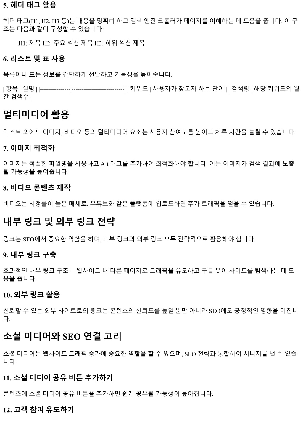 5. 헤더태그활용 헤더태그(H1, H2, H3 등)는내용을명확히하고검색엔진크롤러가페이지를이해하는데도움을줍니다. 이구 조는다음과같이구성할수있습니다: H1: 제목 H2: 주요섹션제목 H3: 하위섹션제목 6. 리스트및표사용 목록이나표는정보를간단하게전달하고가독성을높여줍니다. | 항목 | 설명 | |---------------|--------------------------| | 키워드 | 사용자가찾고자하는단어 | | 검색량 | 해당키워드의월 간검색수 | 멀티미디어활용 텍스트외에도이미지, 비디오등의멀티미디어요소는사용자참여도를높이고체류시간을늘릴수있습니다. 7. 이미지최적화 이미지는적절한파일명을사용하고 Alt 태그를추가하여최적화해야합니다. 이는이미지가검색결과에노출 될가능성을높여줍니다. 8. 비디오콘텐츠제작 비디오는시청률이높은매체로, 유튜브와같은플랫폼에업로드하면추가트래픽을얻을수있습니다. 내부링크및외부링크전략 링크는 SEO에서중요한역할을하며, 내부링크와외부링크모두전략적으로활용해야합니다. 9. 내부링크구축 효과적인내부링크구조는웹사이트내다른페이지로트래픽을유도하고구글봇이사이트를탐색하는데도 움을줍니다. 10. 외부링크활용 신뢰할수있는외부사이트로의링크는콘텐츠의신뢰도를높일뿐만아니라 SEO에도긍정적인영향을미칩니 다. 소셜미디어와 SEO 연결고리 소셜미디어는웹사이트트래픽증가에중요한역할을할수있으며, SEO 전략과통합하여시너지를낼수있습 니다. 11. 소셜미디어공유버튼추가하기 콘텐츠에소셜미디어공유버튼을추가하면쉽게공유될가능성이높아집니다. 12. 고객참여유도하기