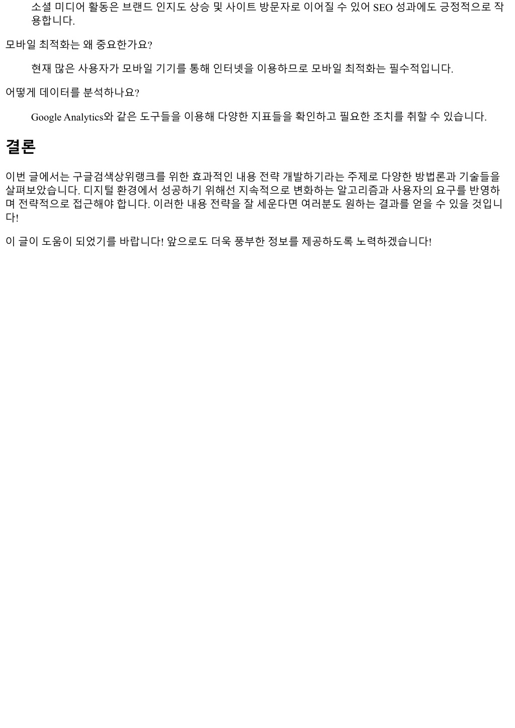 소셜미디어활동은브랜드인지도상승및사이트방문자로이어질수있어 SEO 성과에도긍정적으로작 용합니다. 모바일최적화는왜중요한가요? 현재많은사용자가모바일기기를통해인터넷을이용하므로모바일최적화는필수적입니다. 어떻게데이터를분석하나요? Google Analytics와같은도구들을이용해다양한지표들을확인하고필요한조치를취할수있습니다. 결론 이번글에서는구글검색상위랭크를위한효과적인내용전략개발하기라는주제로다양한방법론과기술들을 살펴보았습니다. 디지털환경에서성공하기위해선지속적으로변화하는알고리즘과사용자의요구를반영하 며전략적으로접근해야합니다. 이러한내용전략을잘세운다면여러분도원하는결과를얻을수있을것입니 다! 이글이도움이되었기를바랍니다! 앞으로도더욱풍부한정보를제공하도록노력하겠습니다!