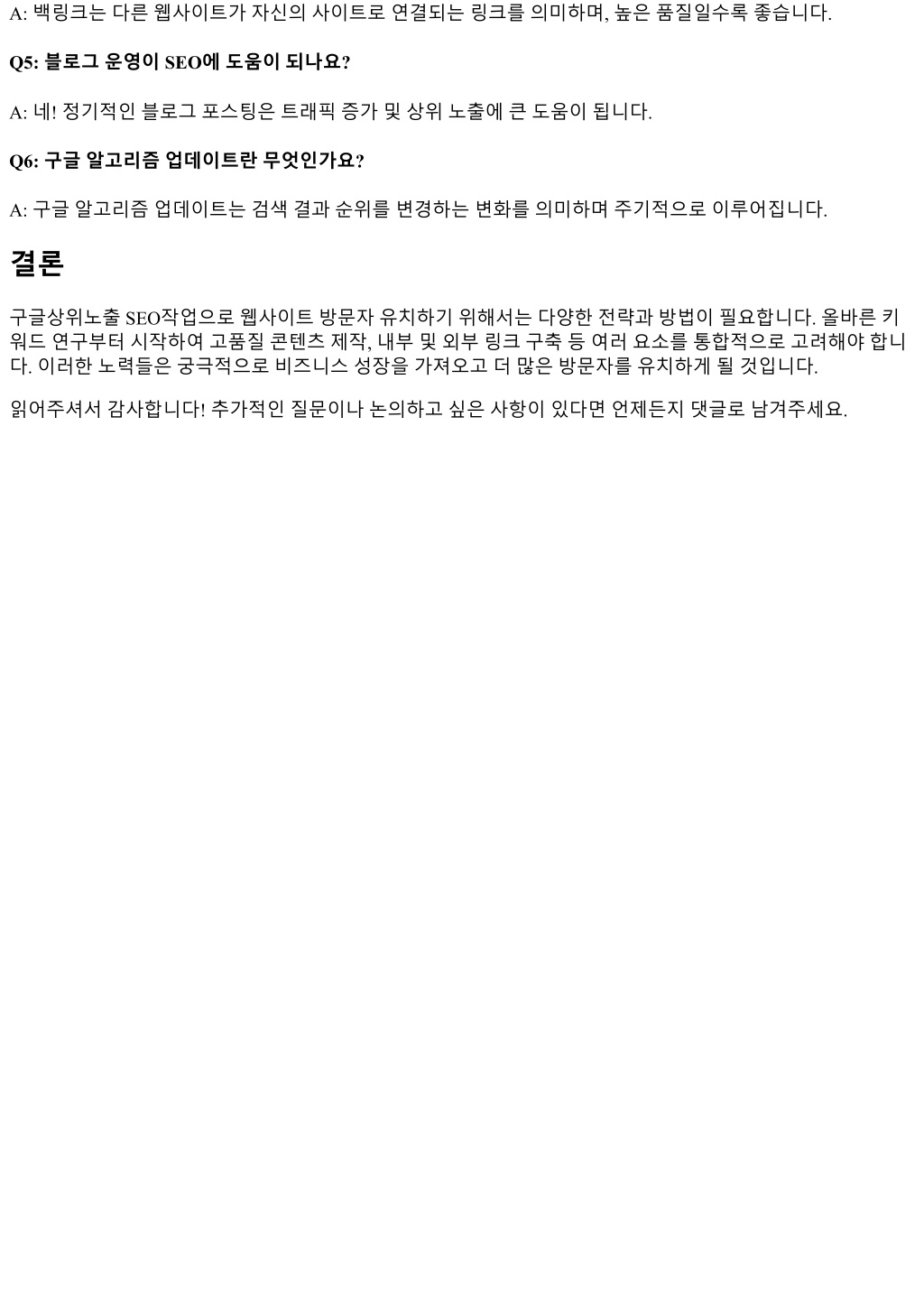 A: 백링크는다른웹사이트가자신의사이트로연결되는링크를의미하며, 높은품질일수록좋습니다. Q5: 블로그운영이 SEO에도움이되나요? A: 네! 정기적인블로그포스팅은트래픽증가및상위노출에큰도움이됩니다. Q6: 구글알고리즘업데이트란무엇인가요? A: 구글알고리즘업데이트는검색결과순위를변경하는변화를의미하며주기적으로이루어집니다. 결론 구글상위노출 SEO작업으로웹사이트방문자유치하기위해서는다양한전략과방법이필요합니다. 올바른키 워드연구부터시작하여고품질콘텐츠제작, 내부및외부링크구축등여러요소를통합적으로고려해야합니 다. 이러한노력들은궁극적으로비즈니스성장을가져오고더많은방문자를유치하게될것입니다. 읽어주셔서감사합니다! 추가적인질문이나논의하고싶은사항이있다면언제든지댓글로남겨주세요.